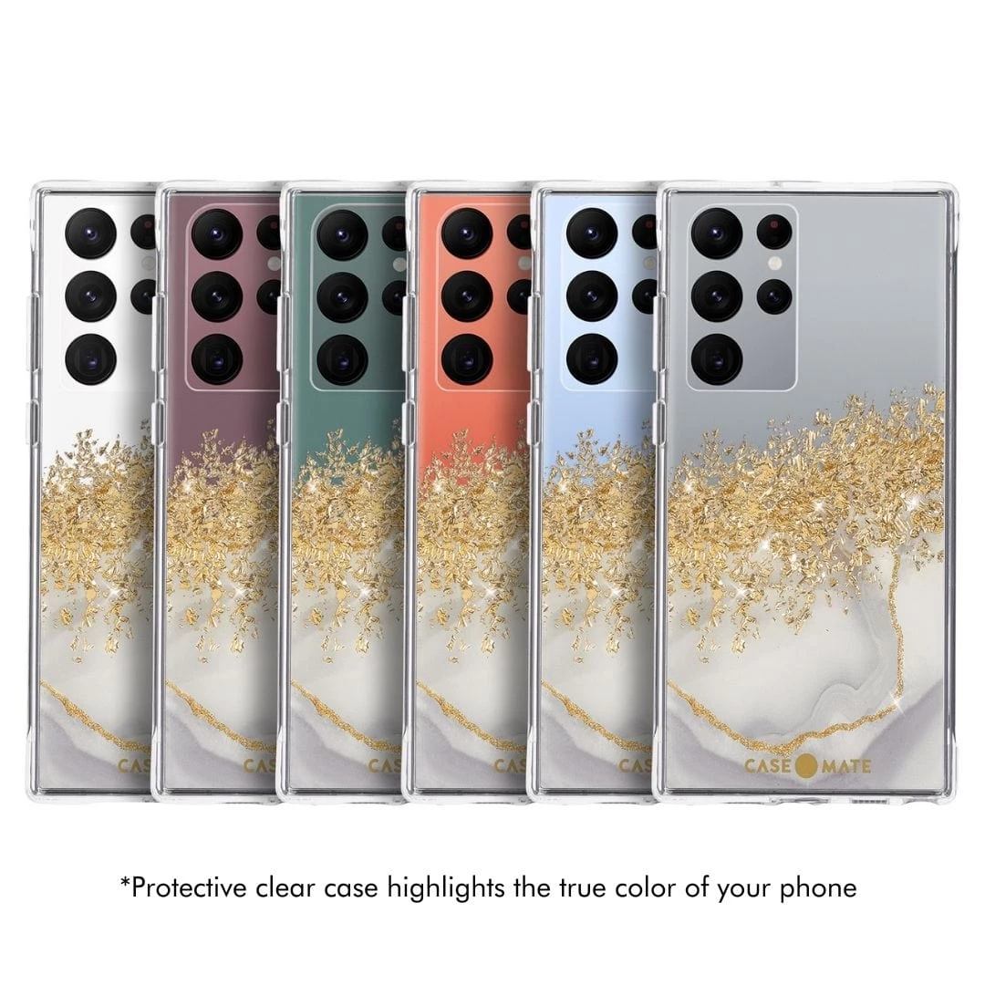 The new Karat Marble case for Galaxy S22 Ultra is crafted with the same quality you know and trust, now using standard certified recycled content, creating less demand for limited resources. The semi-opaque marble design with gold karat accents lets the natural beauty of your device shine through. All that and 10 foot drop protection- this case is sustainable, protected, with a hint of luxury.