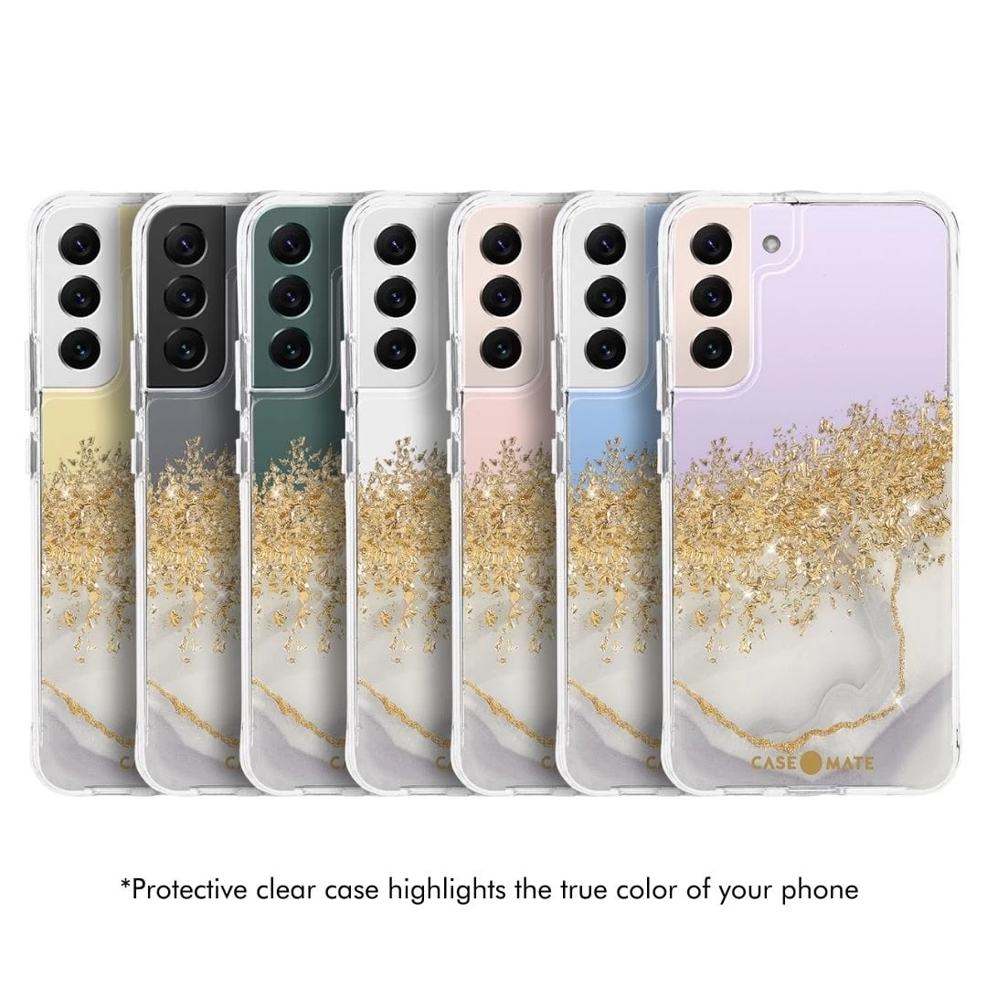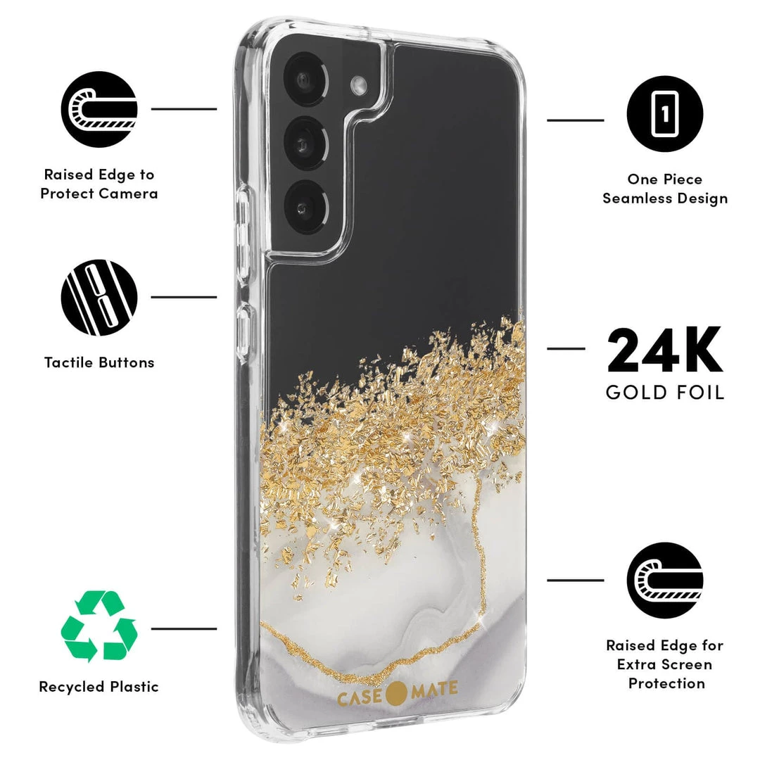 The new Karat Marble case for Galaxy S22+ is crafted with the same quality you know and trust, now using standard certified recycled content, creating less demand for limited resources. The semi-opaque marble design with gold karat accents lets the natural beauty of your device shine through. All that and 10 foot drop protection- this case is sustainable, protected, with a hint of luxury.