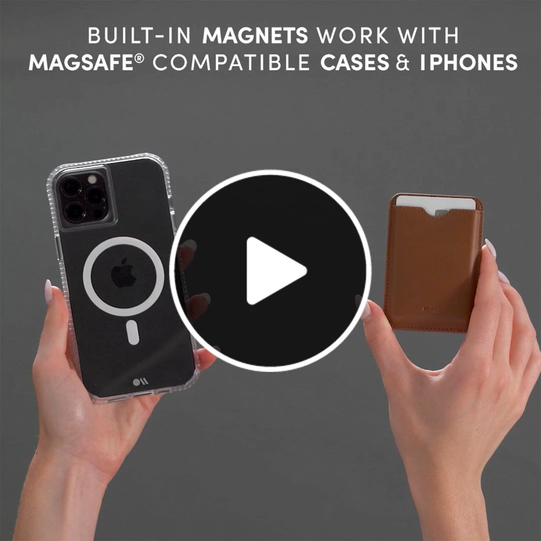 Slim, compact, secure. Seamlessly integrate the Magnetic Card Holder onto your MagSafe compatible case or iPhone. Hold up to three cards or cash and feel secure with the ultra strong built-in magnets that lock the wallet into place. With its slim silhouette and smooth vegan leather finish, the non-intrusive Magnetic Card Holder becomes like a second skin on your phone.
