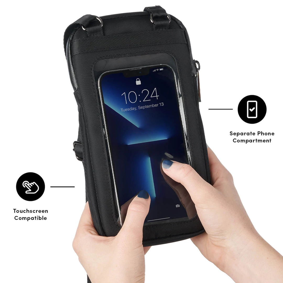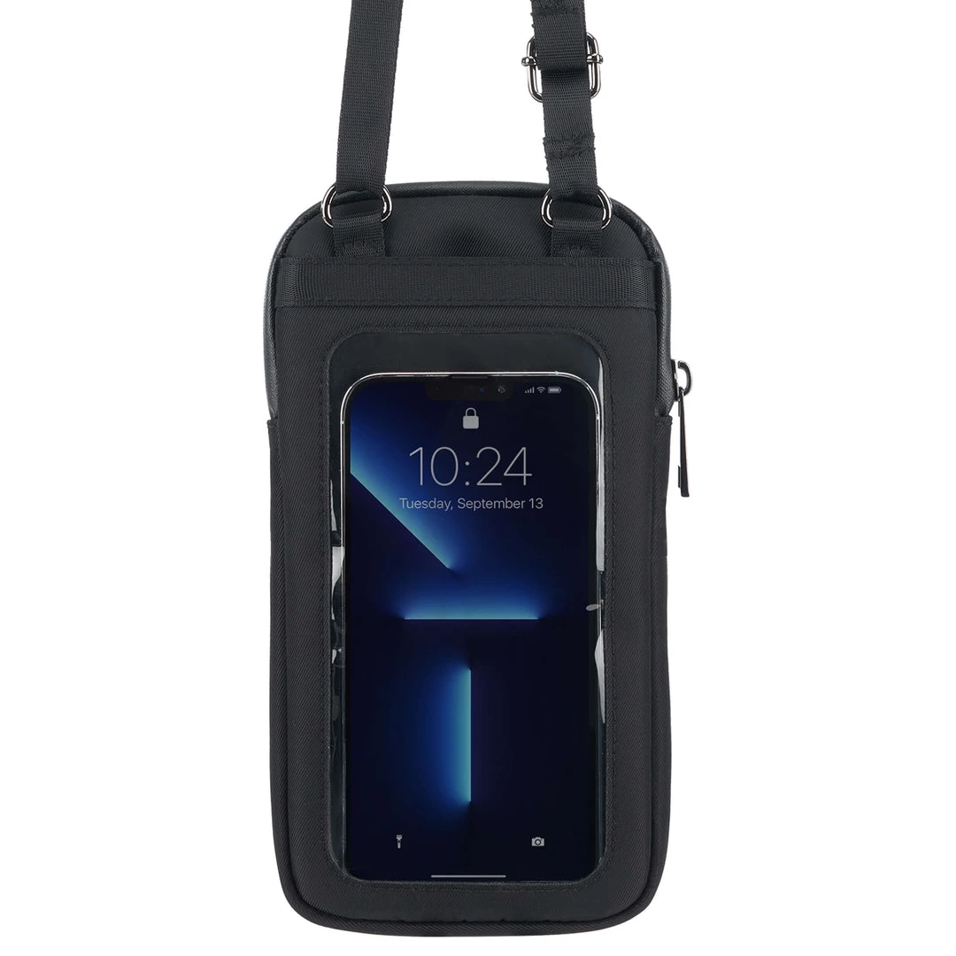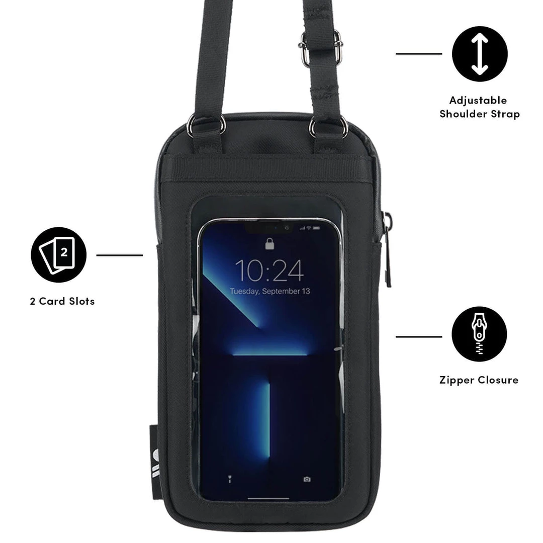 The ultimate mobile crossbody to carry your phone and essentials! Conveniently tote your phone, keys, cash and other essentials in this compact, trendy bag. The shoulder strap adjusts to your desired length, so you can wear it however you like! The Phone Crossbody features a separate phone compartment constructed of mobile friendly clear material allowing you to keep using your phone without having to remove it.
