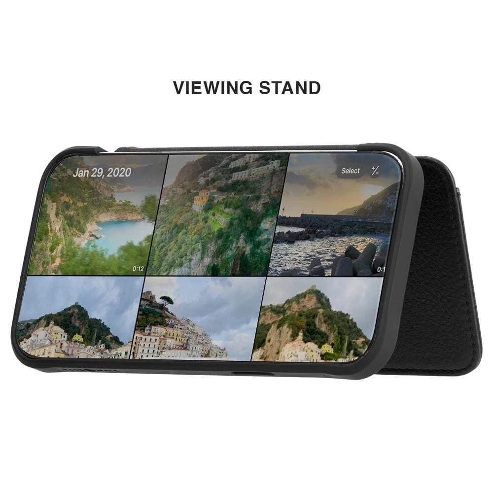 The exterior is crafted from premium pebbled genuine leather with a built-in landscape stand feature and pockets to hold cards or cash.