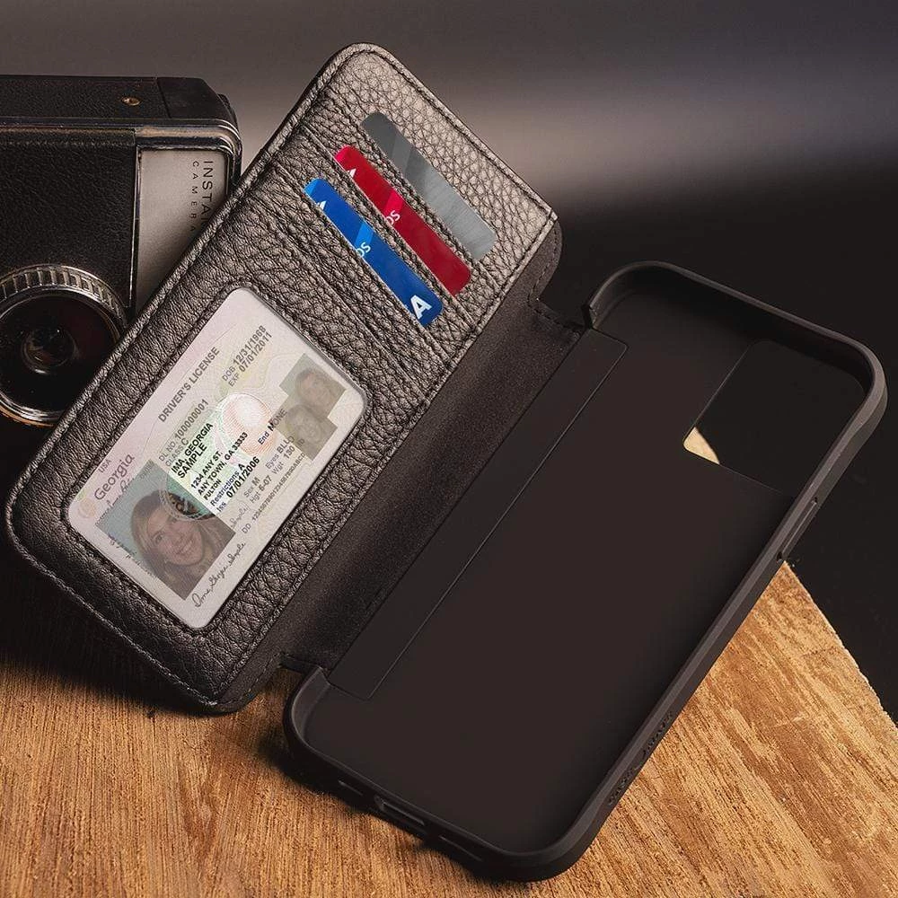The exterior is crafted from premium pebbled genuine leather with a built-in landscape stand feature and pockets to hold cards or cash. Grab your Wallet Folio and go!