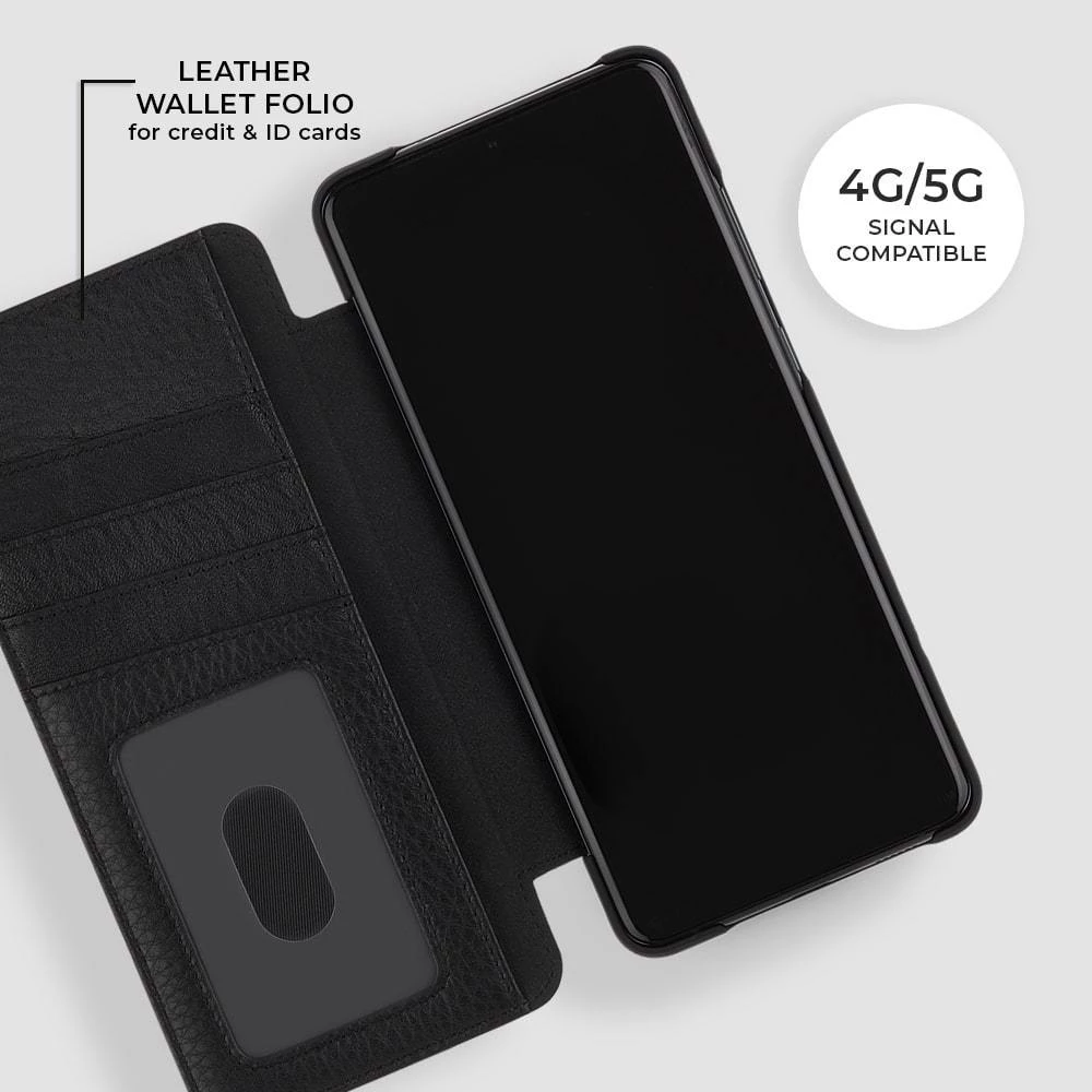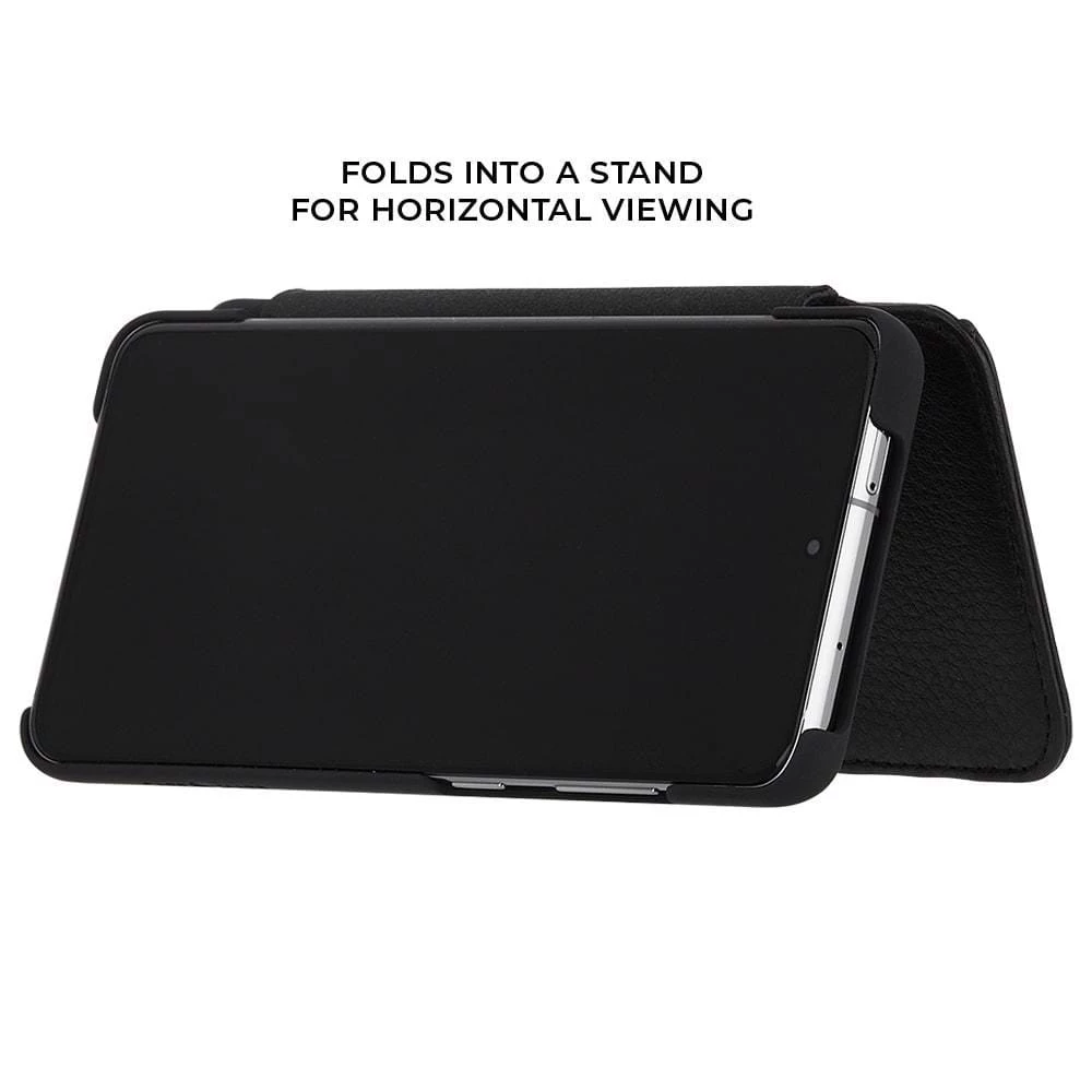 The exterior is crafted from premium pebbled genuine leather with a built-in landscape stand feature and three pockets to hold cards or cash. Grab your Wallet Folio and go!