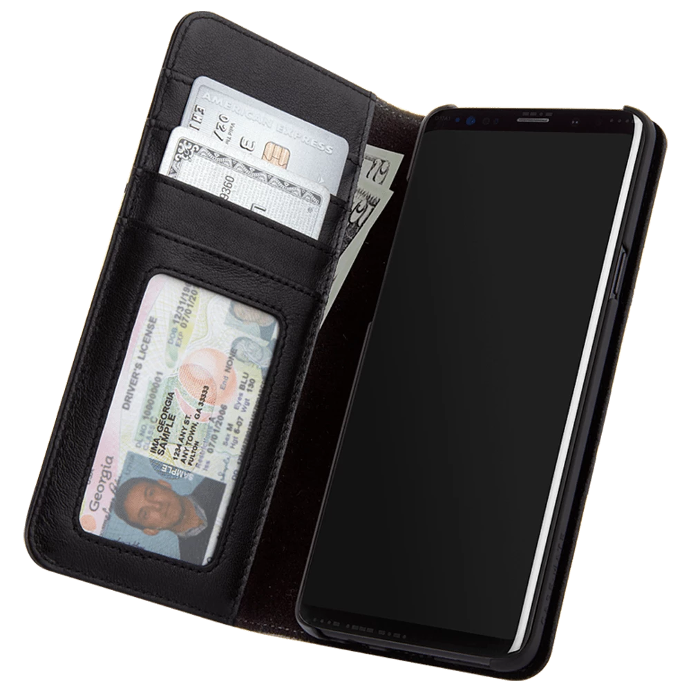 The exterior is crafted from premium pebbled genuine leather with a built-in landscape stand feature and three pockets to hold cards or cash. Grab your Wallet Folio and go!