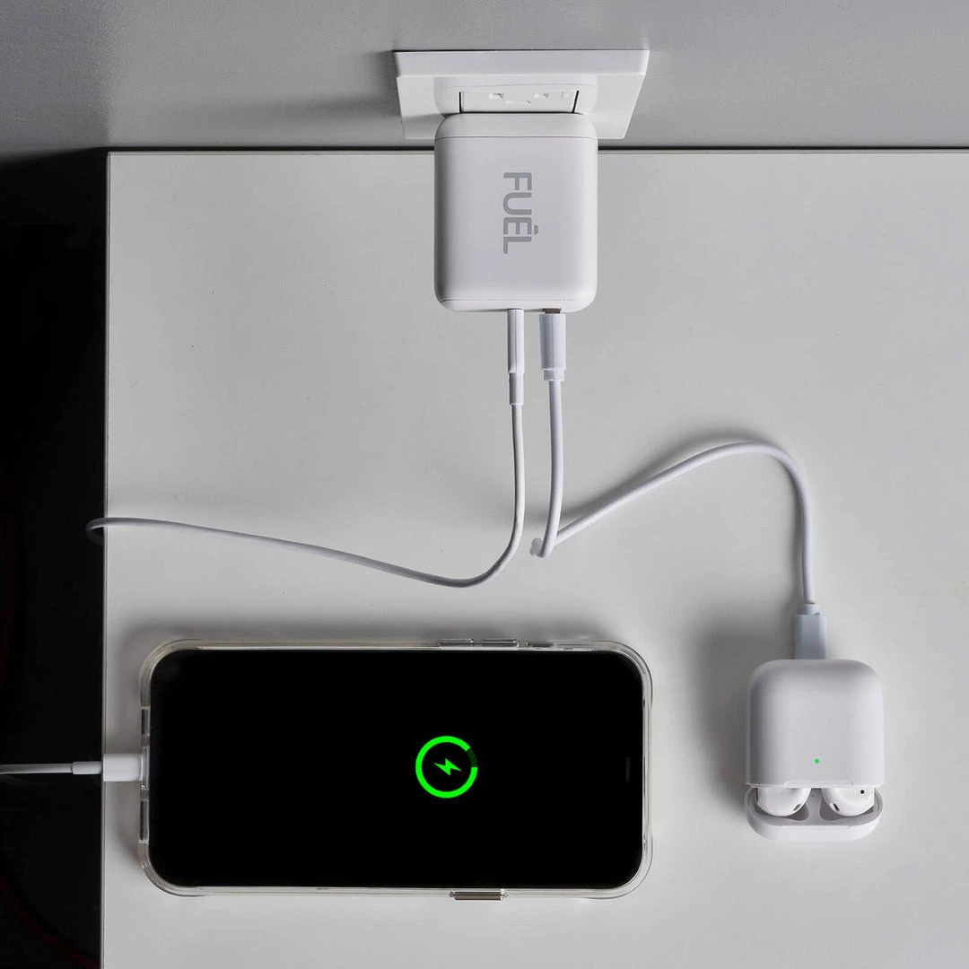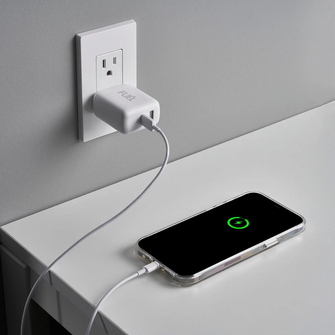 The FUÄ’L 32W Wall Charger provides you with ultra-fast charging for Apple and Android devices. Equipped with USB-A 12W and USB-C 20W ports, you can charge two devices at the same time for ultimate convenience on-the-go. The Smart Power Regulator automatically optimizes output to safely charge your devices.