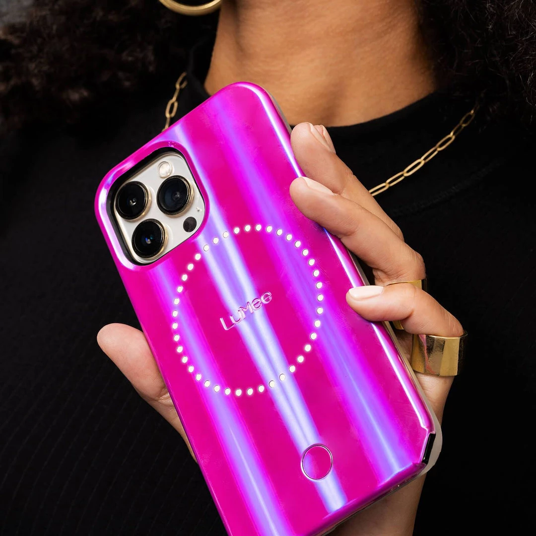 LuMee + Pink + Iridescent = Iconic. The Pink Voltage case features a pop of HOT pink color and an iridescent finish, making it an eye-catching addition to your phone case collection. Two words: flashy and sassy! Not to mention, the front and back lighting will keep you selfie ready at all times! Say hello to your handheld lighting studio!