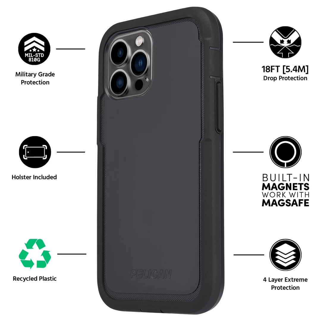 The Pelican™ Voyager case w/ MagSafe for the iPhone 13 Pro protects against impact and shock, all while preserving your device’s functionality. Now equipped with built-in magnets, the Pelican Voyager case supports Apple MagSafe® chargers and accessories. Four layers of rigid polycarbonate and energy-absorbing TPR and PU rubber disperse impact energy, and we’ve tested it to military specifications to survive multiple drops.