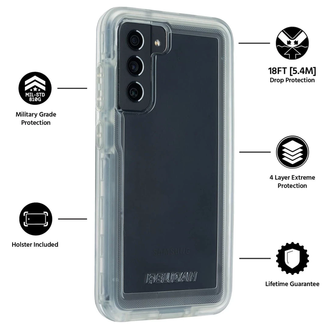The Pelican™ Voyager case for the Samsung Galaxy S21 FE 5G protects against impact, shock, and more. Four layers of rigid polycarbonate and energy-absorbing TPR and PU rubber disperse impact energy, and we’ve tested it to military specifications to survive multiple drops.