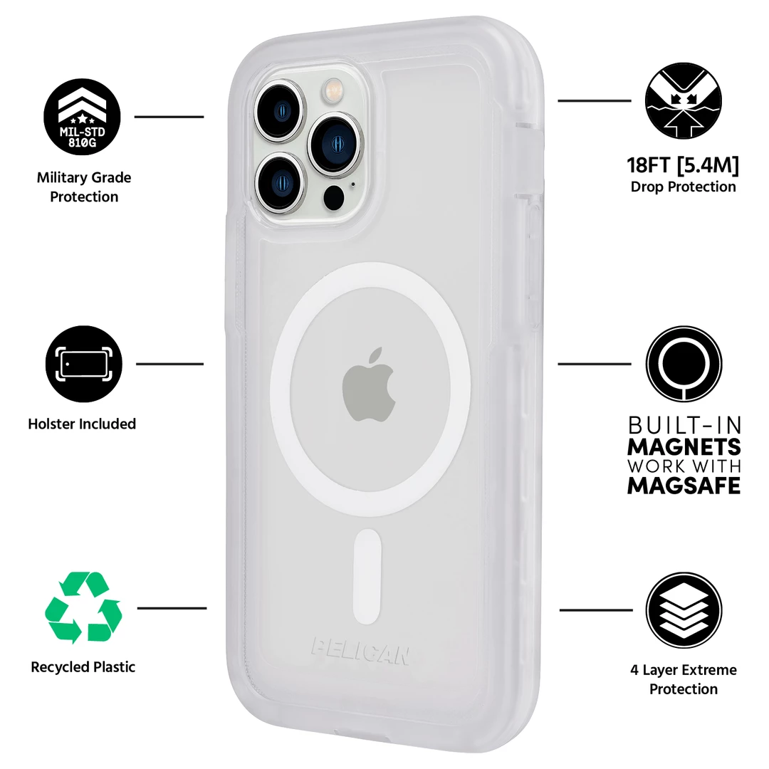 The Pelican™ Voyager case w/ MagSafe for the iPhone 13 Pro protects against impact and shock, all while preserving your device’s functionality. Now equipped with built-in magnets, the Pelican Voyager case supports Apple MagSafe® chargers and accessories. Four layers of rigid polycarbonate and energy-absorbing TPR and PU rubber disperse impact energy, and we’ve tested it to military specifications to survive multiple drops.
