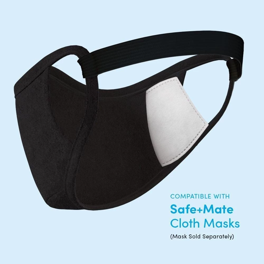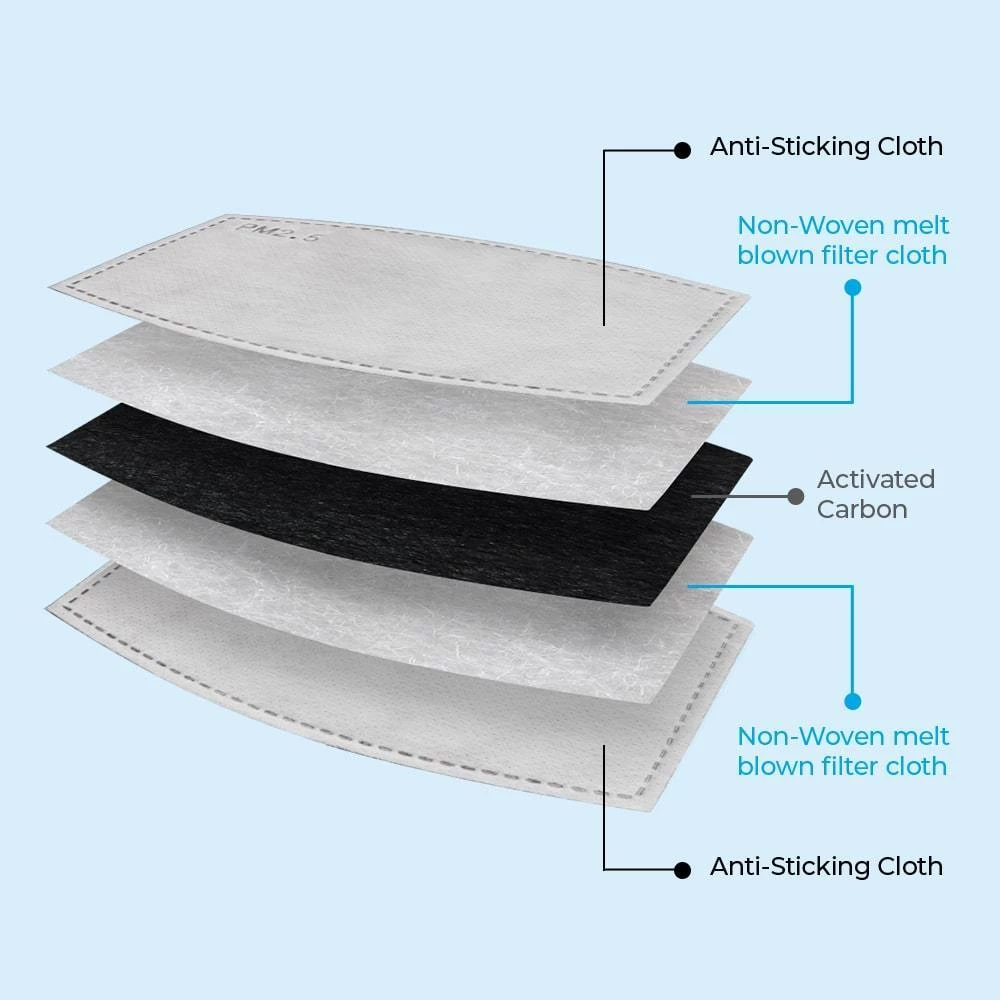 Replacement Filters for the reusable Safe+Mate Cloth Masks are crafted using a 5 layer air filtration system. There are 10 filters included in a pack that is made of 2 layers of anti-sticking cloth, 1 layer of activated carbon, and 2 layers of non-woven melt-blown filter cloth.